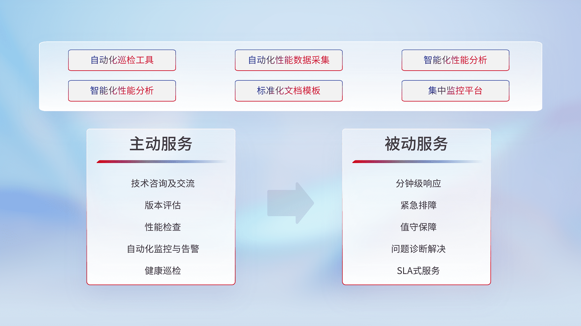 智能化工具和标准化文档,,,,保障服务质量,,提供主动服务(包含技术咨询、、版本评估、、、、性能检查、、自动化监控与告警、、、、健康巡检)和被动服务包含(分钟级响应、、、、紧急排障、、值守保障、、问题诊断解决、、、SLA服务)。。。。